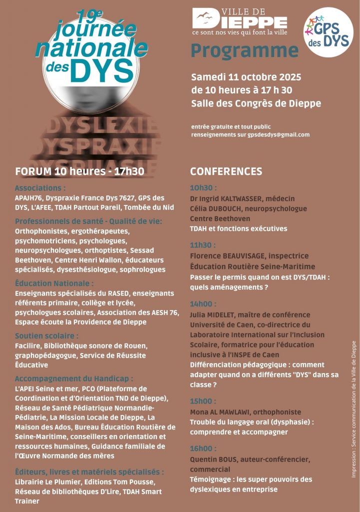 Forum d’information dans le cadre de la Journée Nationale des DYS ce samedi 11 octobre 10h-17h30 Salle des Congrès à Dieppe